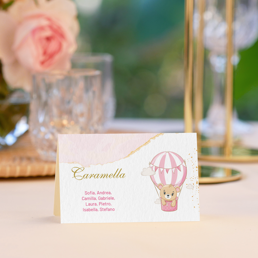 Segnatavolo pieghevole Battesimo orsetto in mongolfiera
