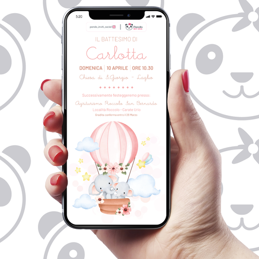 Digital invitation for baby girl baptism with elephants in a hot air balloon