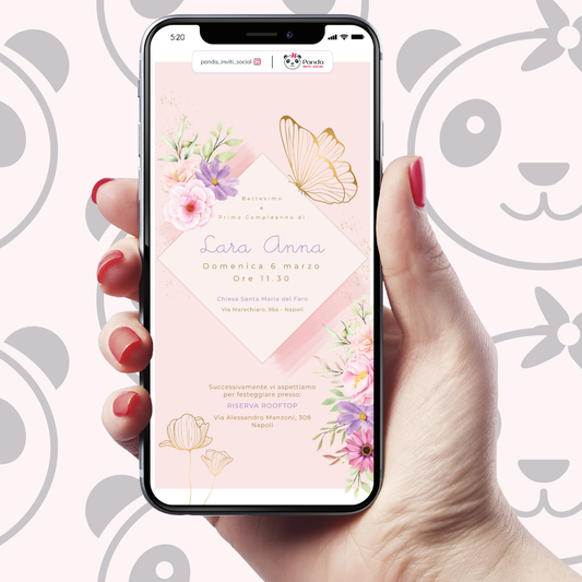 Digital invitation for baby girl baptism with flowers and butterflies