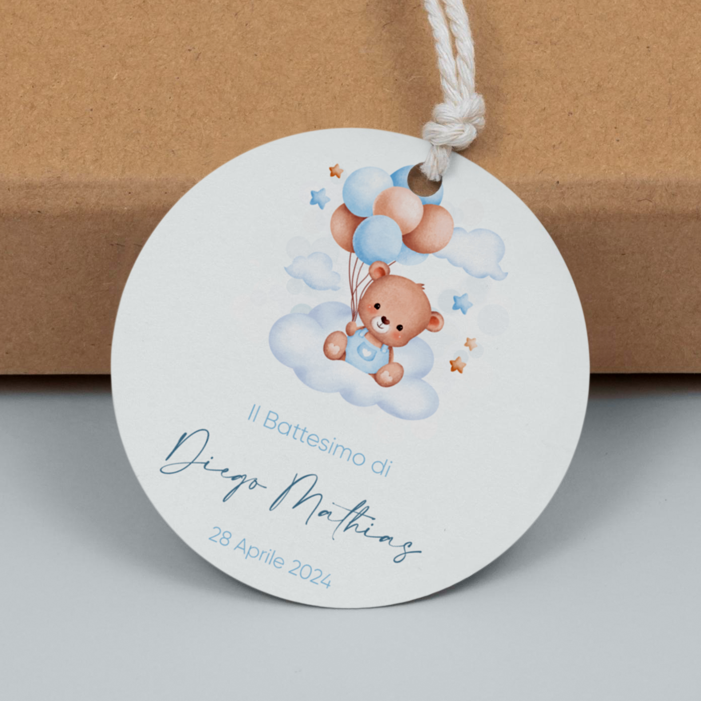 Tag Bomboniera Battesimo bambino orsetto sulla nuvola con palloncini